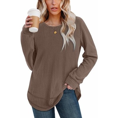 WIHOLL Tunic Tops for Women Loose Fit Dressy Waffle Knit Long Sleeve Shirts Trendy Fall Fashion Crewneck Sweaters Curved Hem